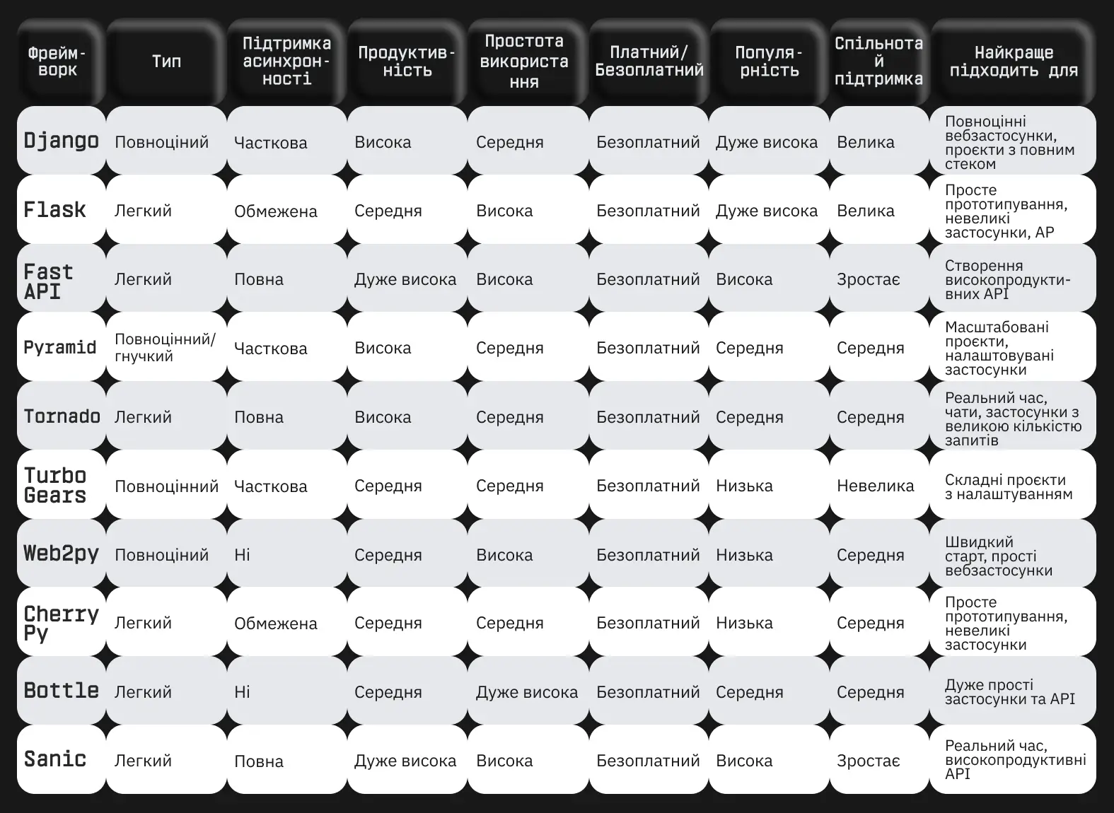 Нижче ми розберемо найактуальніші Python-вебфреймворки детальніше та порівняємо їх: