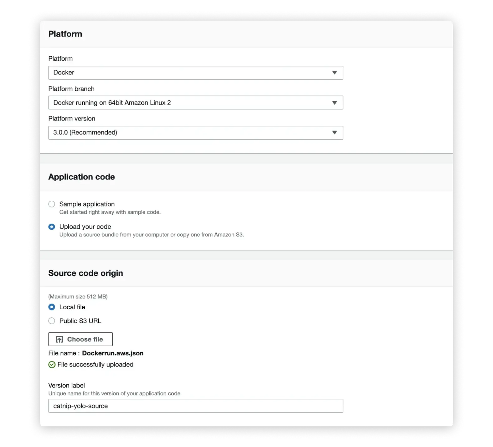 8. Тепер нам потрібно завантажити код застосунку. Оскільки наш застосунок упаковано в Docker-контейнер, потрібно просто вказати EB про контейнер. Відкрийте файл Dockerrun.aws.json, що розташований у каталозі flask-app, і змініть ім’я образу на ім’я вашого образу. Далі оберіть Upload your Code, виберіть цей файл і натисніть Upload.