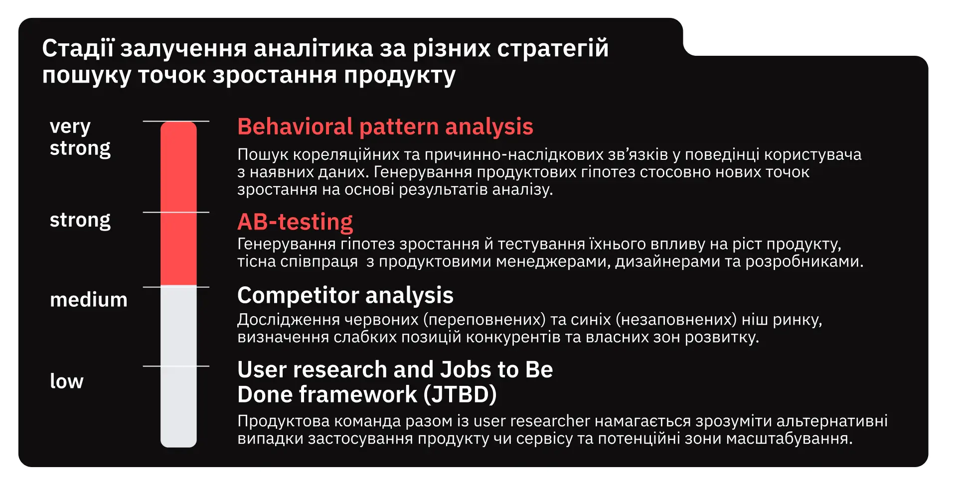 - низький (low): user research and jobs to be done;
