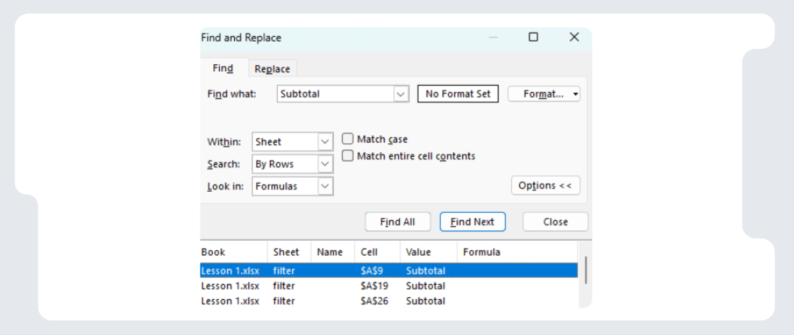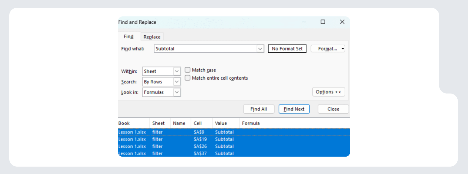Excel знайде всі рядки, де є Subtotal, після цього натискаємо Ctrl+A, тобто виділити все.