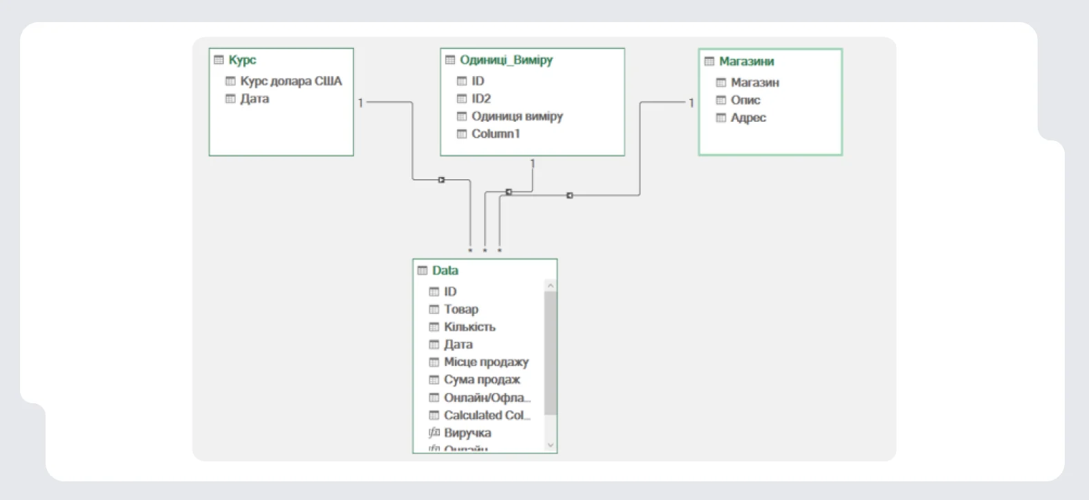 Потім між цими таблицями можна зробити зв’язки й здійснювати аналітику, використовуючи формули DAX (щось на кшталт цієї Онлайн:=CALCULATE([Виручка];'Data'[Місце продажу]="Онлайн").