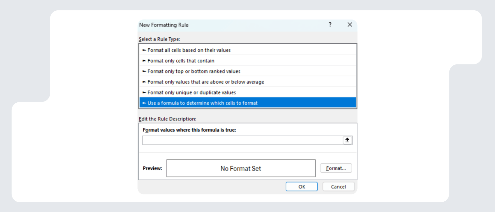 Якщо потрібно щось складніше, можна використати New Rule — створити власне правило, написавши формулу, яка визначатиме його логіку, і задати параметри форматування: колір, шрифт, лінії тощо.