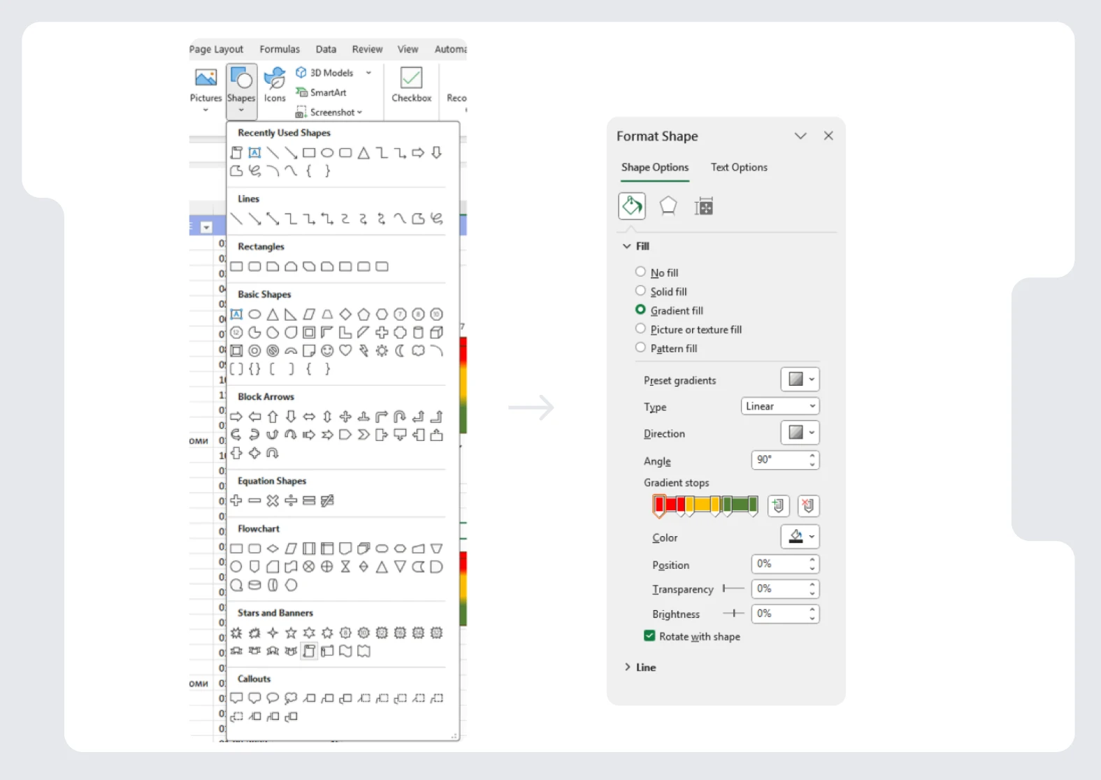 Я скопіював цю форму з фігур, додав до неї градієнтну заливку і вставив у графік, просто копіюючи фігуру. Потім наїхав на будь-який синій стовпець із попереднього графіка і натиснув вставити.