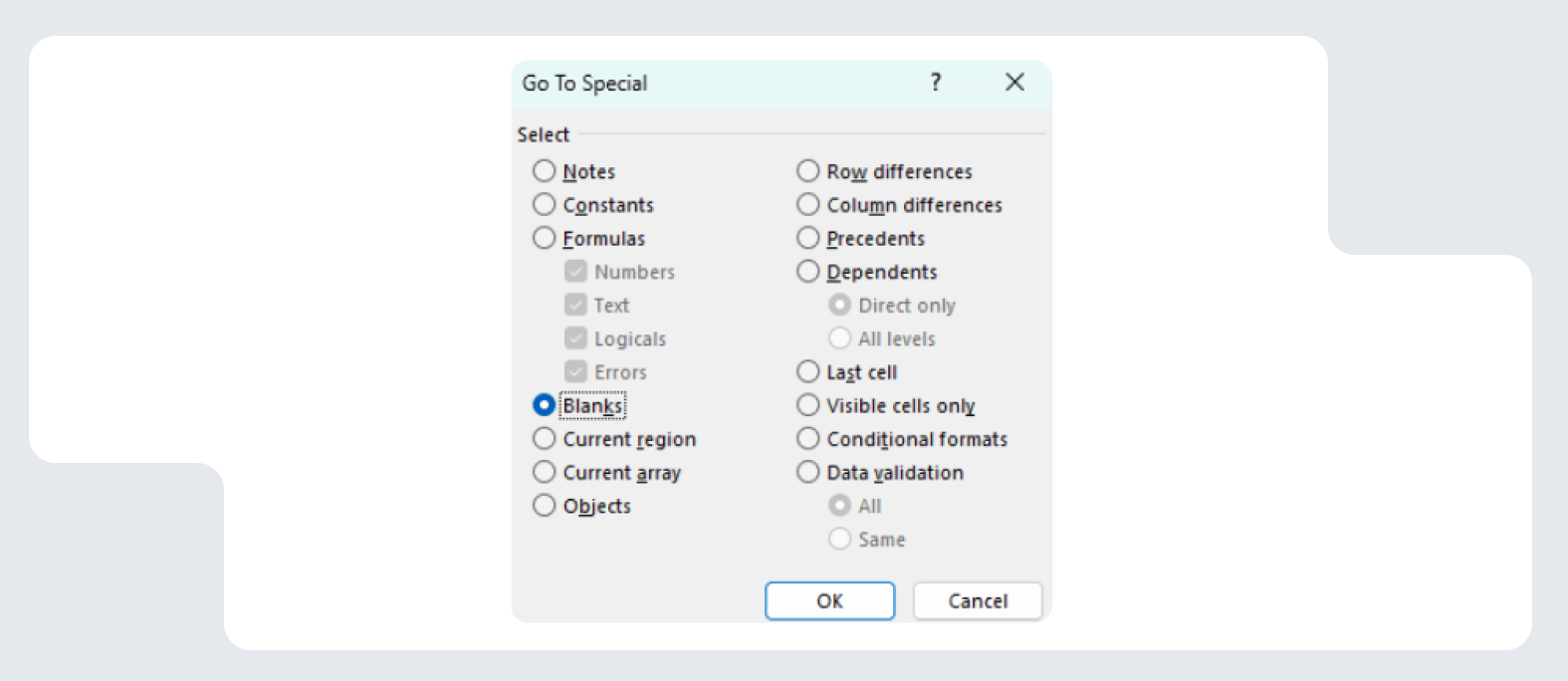 Розглянемо ситуацію: нам потрібно видалити всі рядки з таблиці, якщо в цьому рядку в будь-якому стовпці є пуста клітинка. Для цього натискаємо F5. З’явиться таке віконечко: оберемо тут Blanks, що означає пусті клітинки. І натиснемо ОК.
