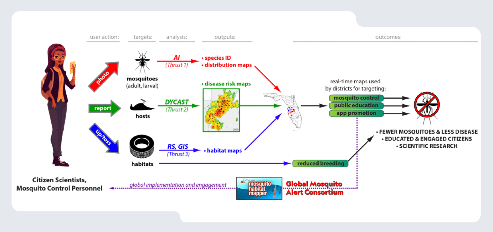 Важливо розуміти, що науковці не винищують комах одиночно щойно бачать загрозу. Натомість розробка має превентивний характер — відстежити зони й території, де є такі комарі, та вжити заходів, щоб запобігти розповсюдженню хвороб. Дані надходять у реальному часі до відповідних установ, що дозволяє швидко визначати гарячі точки зараження.