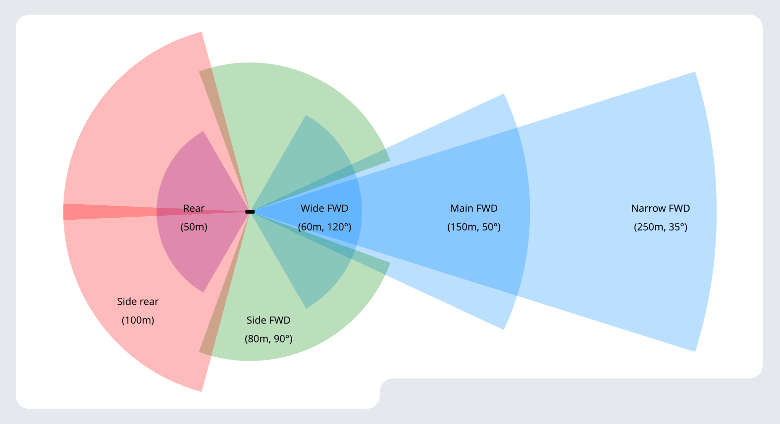 - 8 камер (по периметру) для комп’ютерного зору, які забезпечують повний огляд у 360°.