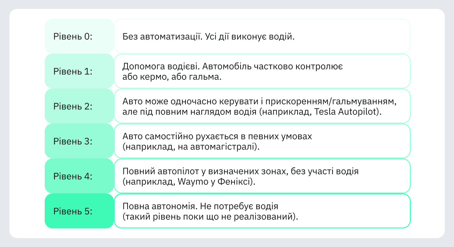 - Рівень 5: повна автоматизація. Автомобіль здатен керувати за будь-яких умов, як людина. Таким автівкам не потрібен жоден елемент взаємодії, як-от системи керування чи безпосередньо сам водій. Важливо зауважити, що рівень 5 — теоретичний ідеал. На практиці, жодна компанія ще не досягла цього рівня.