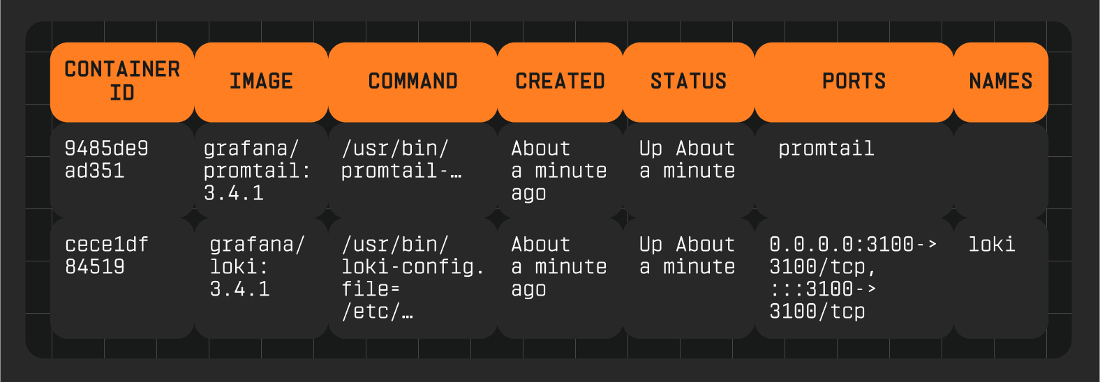docker run --name loki -d -v $(pwd):/mnt/config -p 3100:3100 grafana/loki:3.4.1 -config.file=/mnt/config/loki-config.yaml