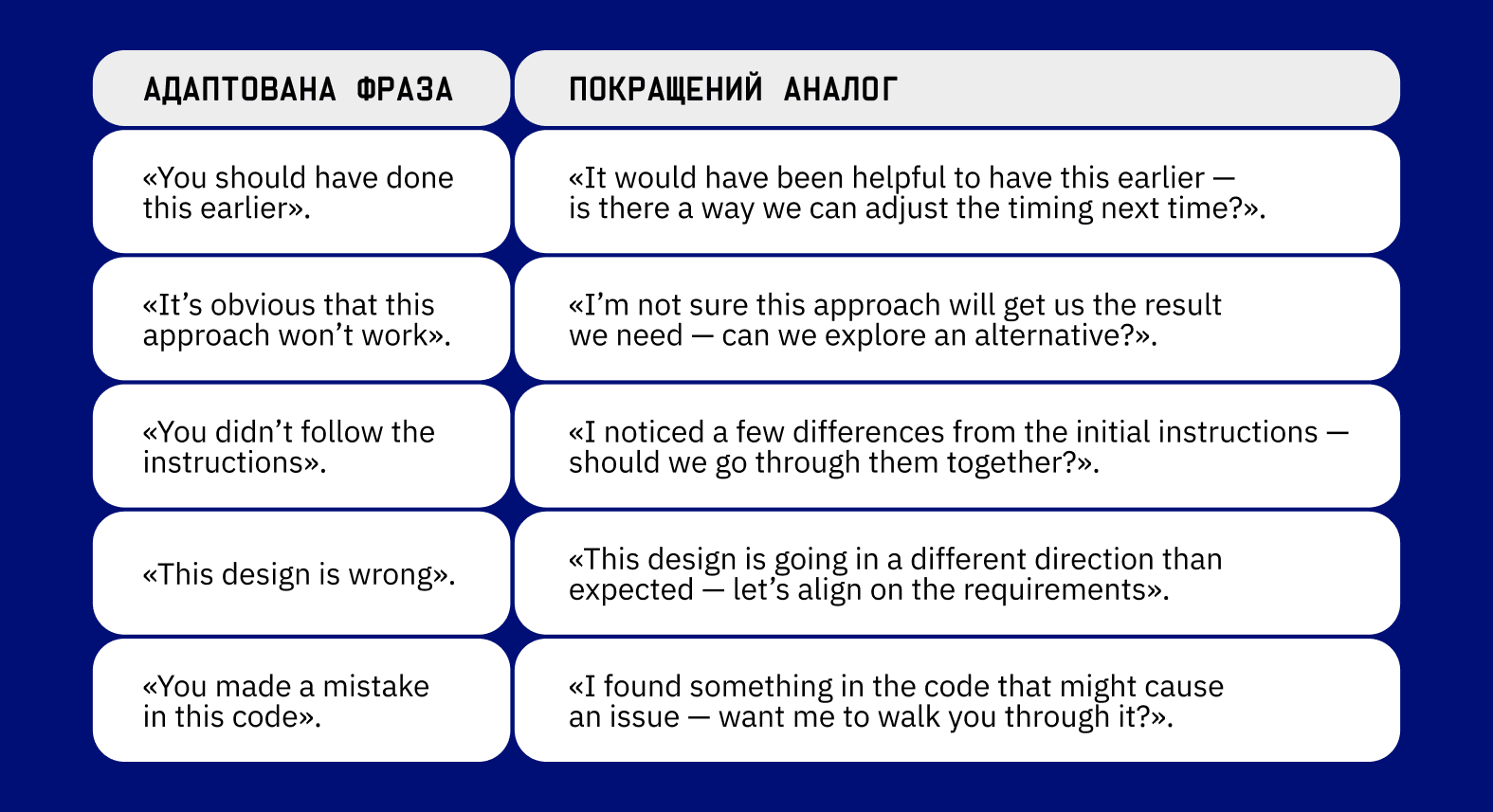 Ось кілька прикладів криво адаптованих фраз українською та покращених аналогів англійською: