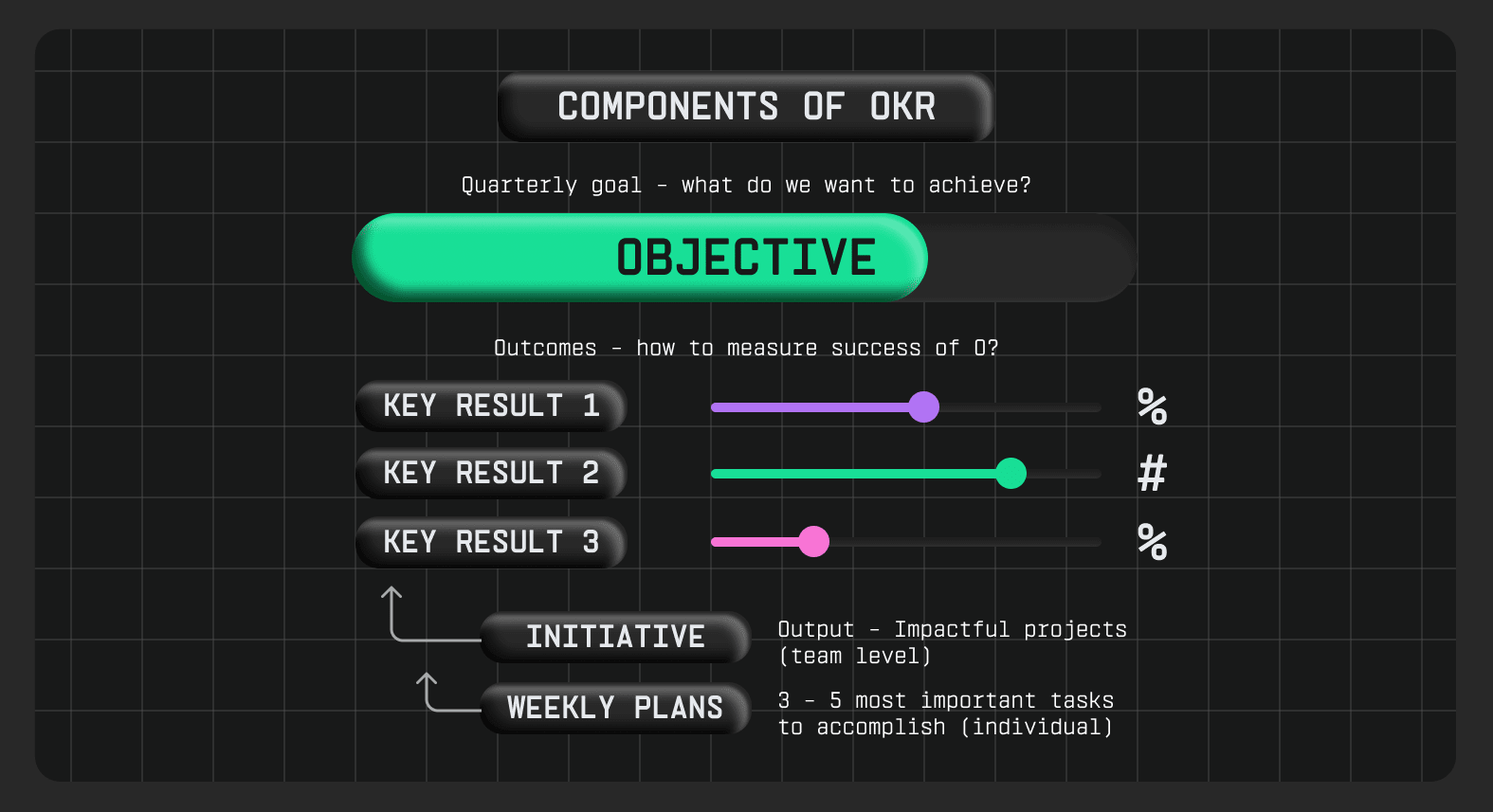 • Key Results — конкретні метрики, за якими можна оцінити прогрес.