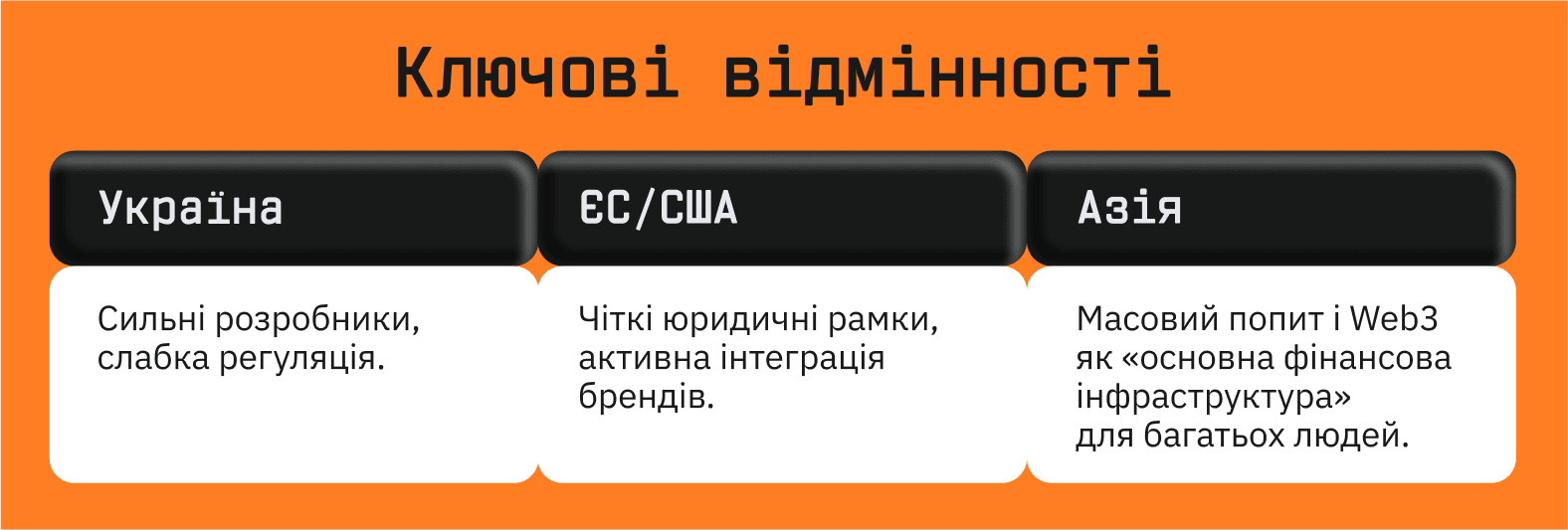• Особливості: висока увага до регуляції (наприклад, MiCA в ЄС), що змушує компанії серйозно ставитися до комплаєнсу та безпеки.