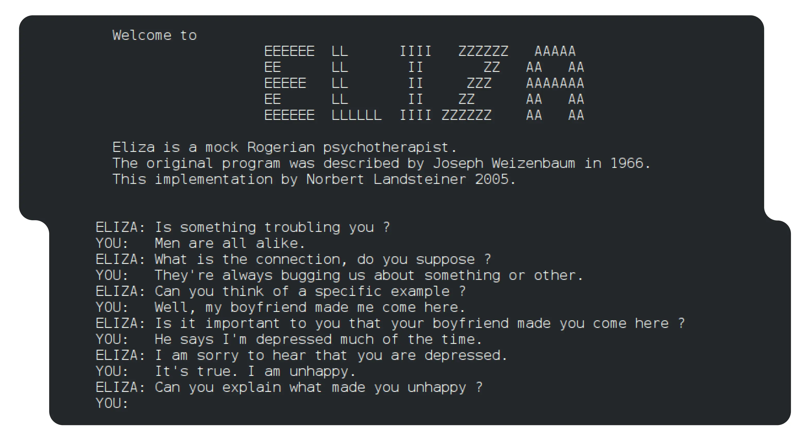 Створена Джозефом Вейценбаумом у MIT, ELIZA була однією з перших програм, здатних підтримувати ілюзію розмови. Вона імітувала психотерапевта, використовуючи простий, але ефективний метод: перефразування слів користувача та постановку запитань у відповідь. ELIZA була першим прототипом чат-бота, який довів, що навіть мінімальна логіка може створювати враження осмисленої комунікації.