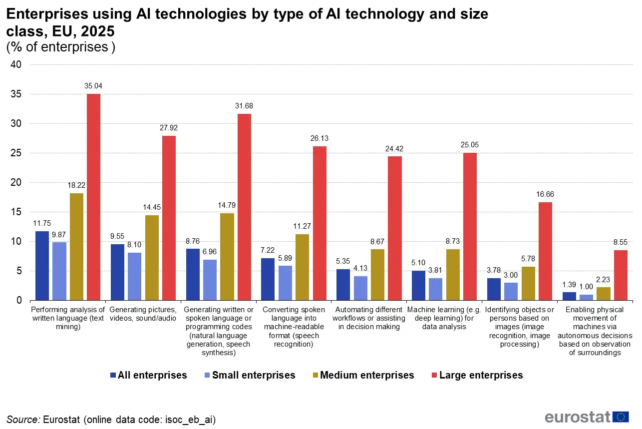 У 2025 році майже не залишилося компаній, які не пробували AI. Як показує дослідження Eurostat, лише в ЄС понад 55% великих компаній використовують АІ. Найбільше — для роботи з текстом, медіа, автоматизації робочих процесів та аналізу.