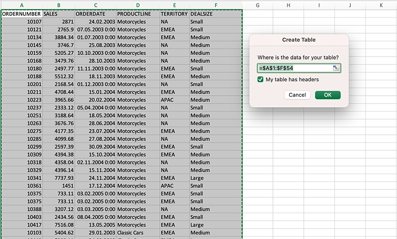 1. Очистивши дані, створюємо таблицю за допомогою «гарячих» клавіш ctrl+A, ctrl+T.