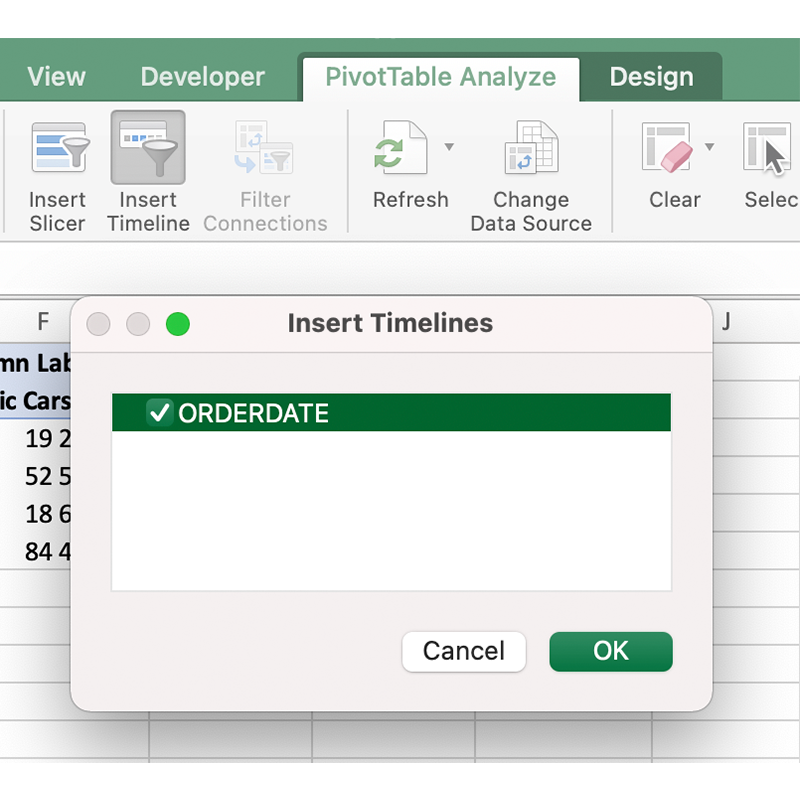 6. У вкладці «Робота зі зведеними таблицями» (Pivot table analyze) обираємо часову шкалу, у ній — колонку з датами зі зведеної таблиці.