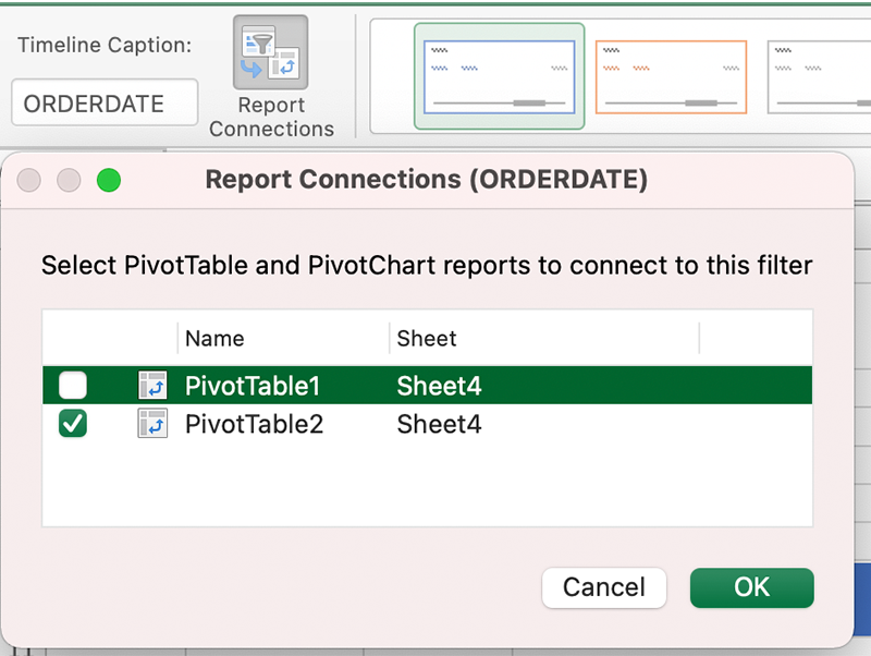 7. Створивши часову шкалу, на вкладці «Підключення до звітів» (Report Connections) обираємо обидві зведені таблиці, графіки з яких хочемо змінювати динамічно.