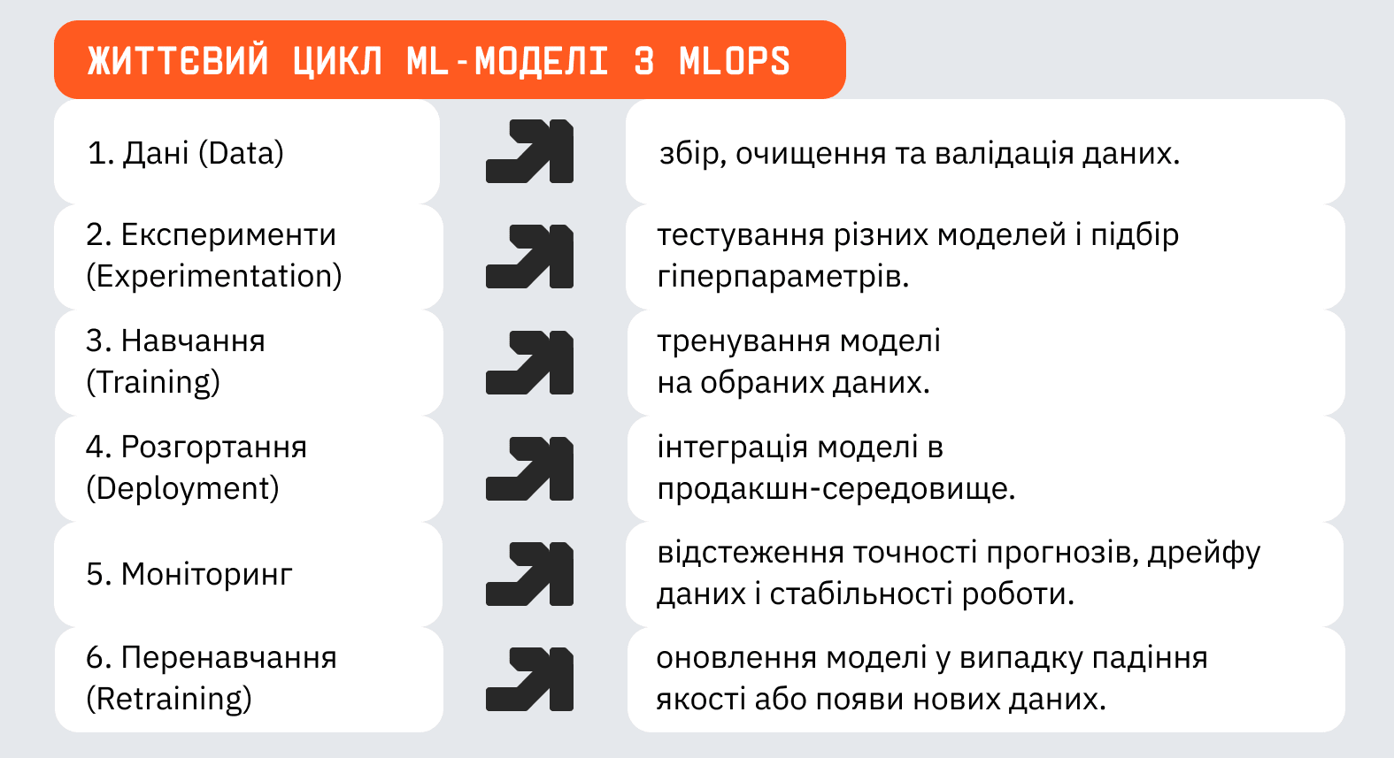В AI-проєктах головне завдання MLOps — зробити роботу з моделями більш зрозумілою й керованою. Це означає можливість повторити будь-який експеримент, автоматизувати навчання та запуск моделей, а також зберігати різні версії даних та самих моделей. Крім того, важливо мати інфраструктуру, з якою можна регулярно оновлювати моделі та постійно стежити за якістю їхніх прогнозів.