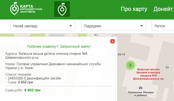 Під час пандемії держустановам дозволили закуповувати медичні товари в прискореному порядку. Щоб знизити корупційні ризики, у Prozorro створили «Карту коронавірусних закупівель», яка оновлюється в режимі реального часу. Вона охоплює всю Україну і розповідає, на які товари та послуги витратили гроші платників податків. Можна шукати закупівлі за назвою/адресою установи або обирати на карті конкретну організацію. Наприклад, карта показує, що Київська міська дитяча лікарня № 6 закупила засоби для дезінфекції на 6 602 грн.