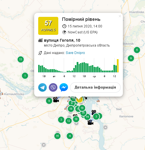 Дніпровські активісти запустили перший в Україні Telegram-екобот SaveEcoBot. Він дає інформацію про якість повітря, а також попереджає про небезпечний рівень забруднень. Інтерактивна карта на сайті проєкту показує вимірювання в режимі реального часу.